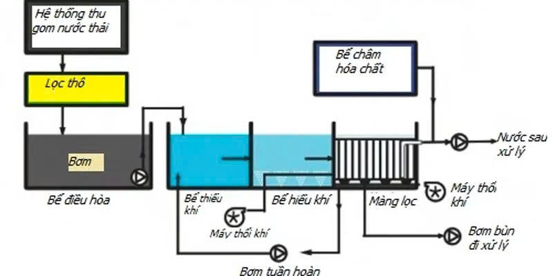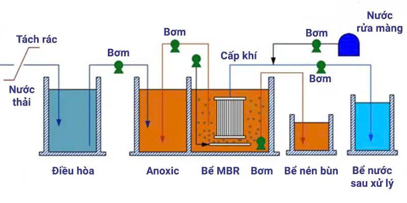 Trong đó, chủ yếu sẽ áp dụng kỹ thuật bùn hoạt tính kết hợp cùng màng lọc tách vi sinh vật. Hàm lượng bùn có trong bể sinh học sẽ được giữ lại nhờ cơ chế vi lọc của màng. Đồng thời nhờ kích thước nhỏ nước thải sau khi chảy qua màng lọc sẽ có chất lượng tốt hơn.